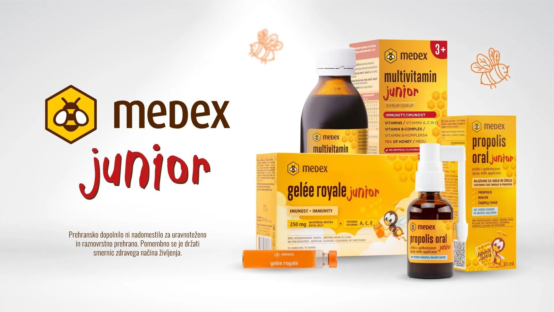 Prehranska dopolnila Junior, namenjena najmlajšim, so razvita in izdelana v Sloveniji ter podpirajo naraven razvoj otrok z izdelki, ki pustijo odkrivanje okusov brez predsodkov. Narejena so iz skrbno izbranih čebeljih pridelkov, zdravilnih zelišč in vitaminov, brez umetnih arom, barvil ali aditivov.